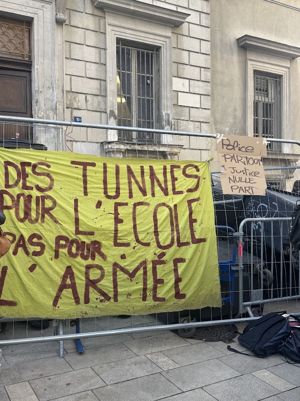 Le message sur les banderoles était sans équivoque : le budget de l’école ne doit pas servir de variable d’ajustement. Pour les manifestants, les coupes budgétaires prévues pour la rentrée 2026 servent directement à financer l’augmentation des dépenses militaires et l’effort de guerre. Cette priorité donnée à l’armement au détriment des moyens d’enseignement (options, dédoublements, postes) est au cœur de la colère exprimée devant l’établissement.